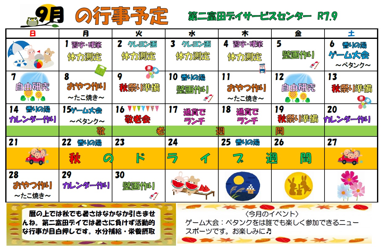 9月は、ゲーム大会~ペタンク~、自由研究、敬老週間、秋のドライブ週間などなど。どうぞお楽しみにしていてください!!