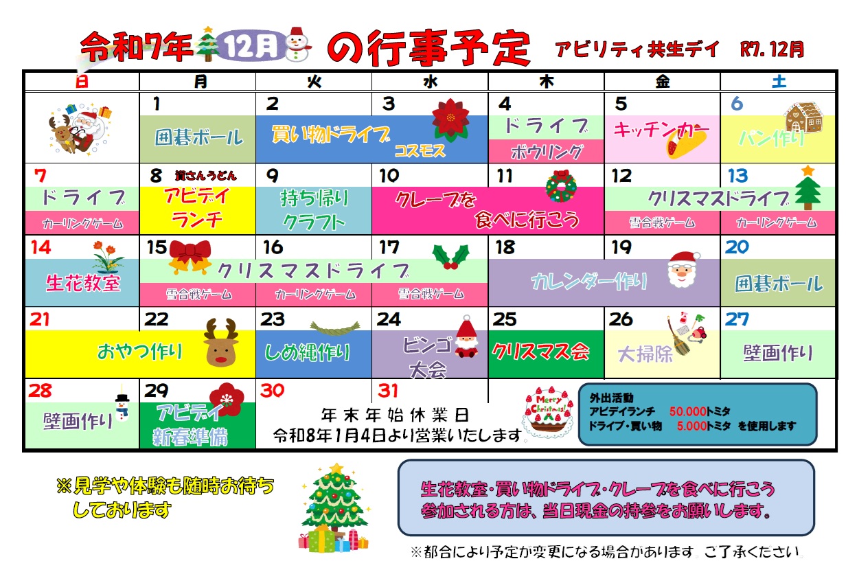 12月は、ボウリング、クレープを食べに行こう、クリスマス会、しめ縄作りなどなど。どうぞお楽しみにしていてください!!