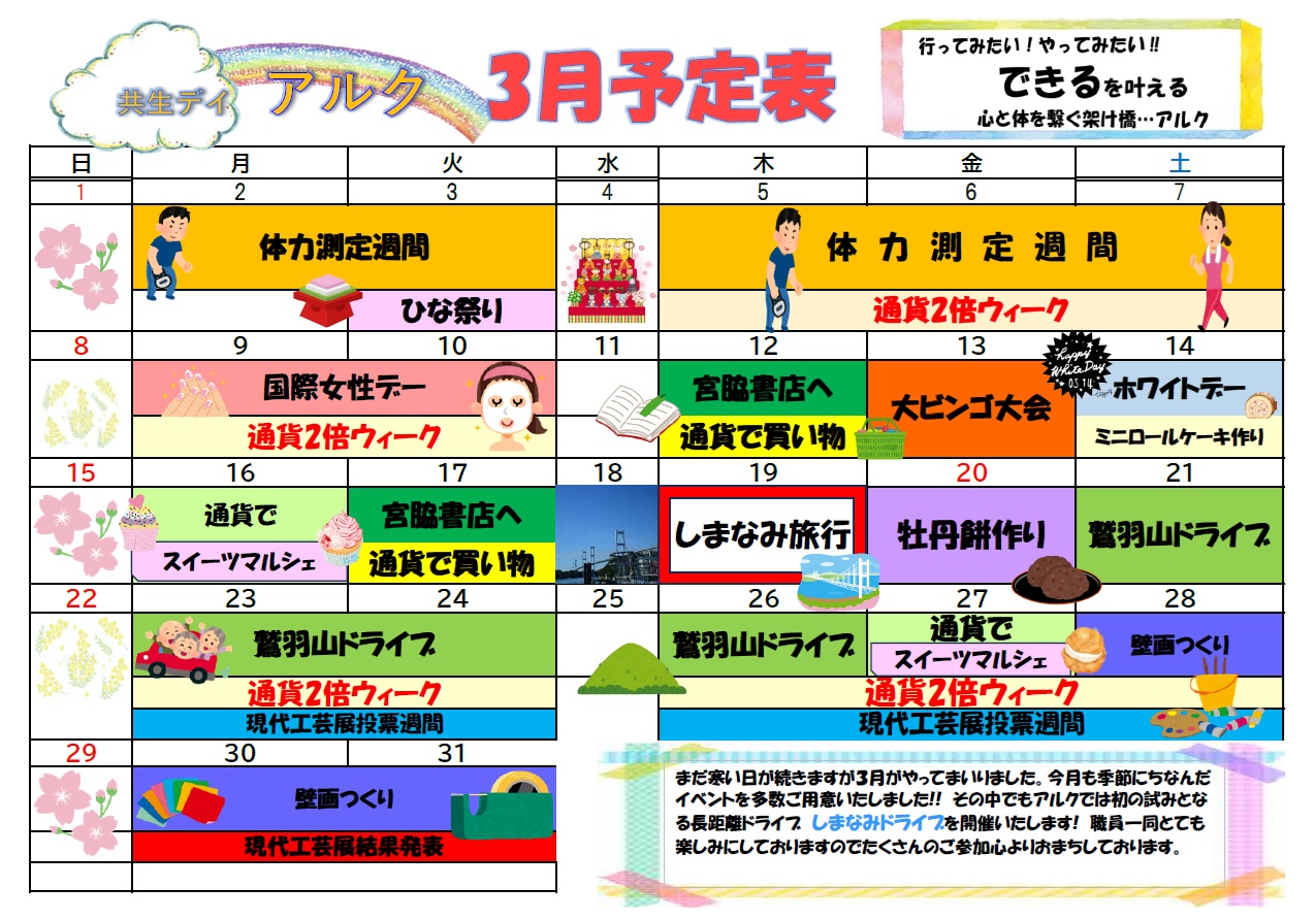 3月は、しまなみ旅行、国際女性デー、牡丹餅作り、鷲羽山ドライブ、大ビンゴ大会などを予定しております。楽しみにしていてください。