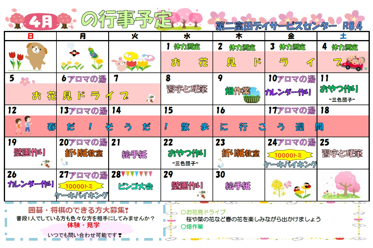 4月は、お花見ドライブ、畑作業、ケーキバイキング、ビンゴ大会、習字と硬筆などなど。どうぞお楽しみにしていてください!!
