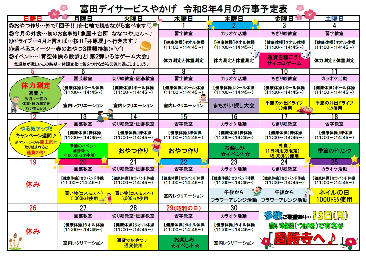 デイサービスやかげ 4月行事予定